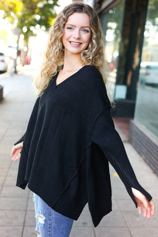 Casual Chic Black Oversized V Neck Rib Knit Sweater